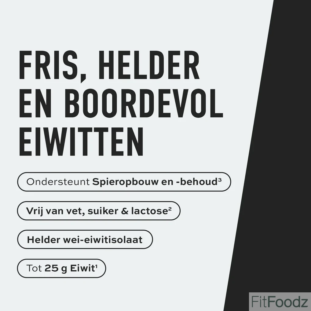 Fresh, clear and full of proteins: Isoclear. Dit is onze verfrissende eiwitdrank die – afhankelijk van de smaak – smaakt als sap, frisdrank of ijsthee. En dat allemaal zonder suiker, vet en lactose!2 Perfect dus om je spieren van eiwitten te voorzien, je eiwitbehoefte makkelijker te dekken of gewoon voor meer variatie in je eiwitroutine.